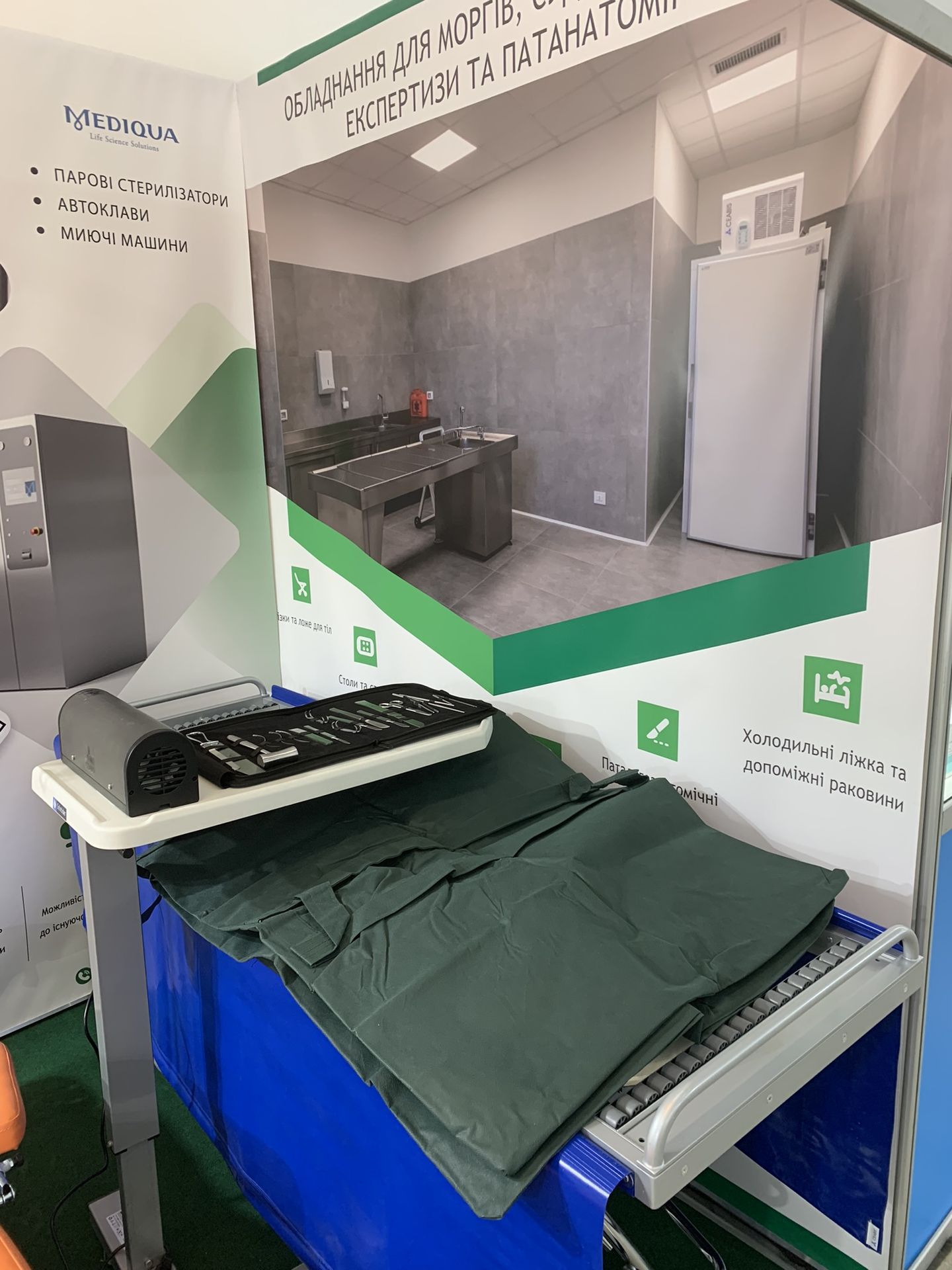 Окрім медичних меблів та діагностичного обладнання, ми також показали наші досягнення в області моргового обладнання. На стенді учасники виставки мали змогу ознайомитись з італійським виробником Ceabis та купити холодильні камери для зберігання померлих, які відповідають найвищим стандартам якості та гігієни, для облаштування моргів. Крім того, було представлено ложе для перекладання тіла та спеціальні візки і каталки, спроектовані для забезпечення безпеки до померлих.