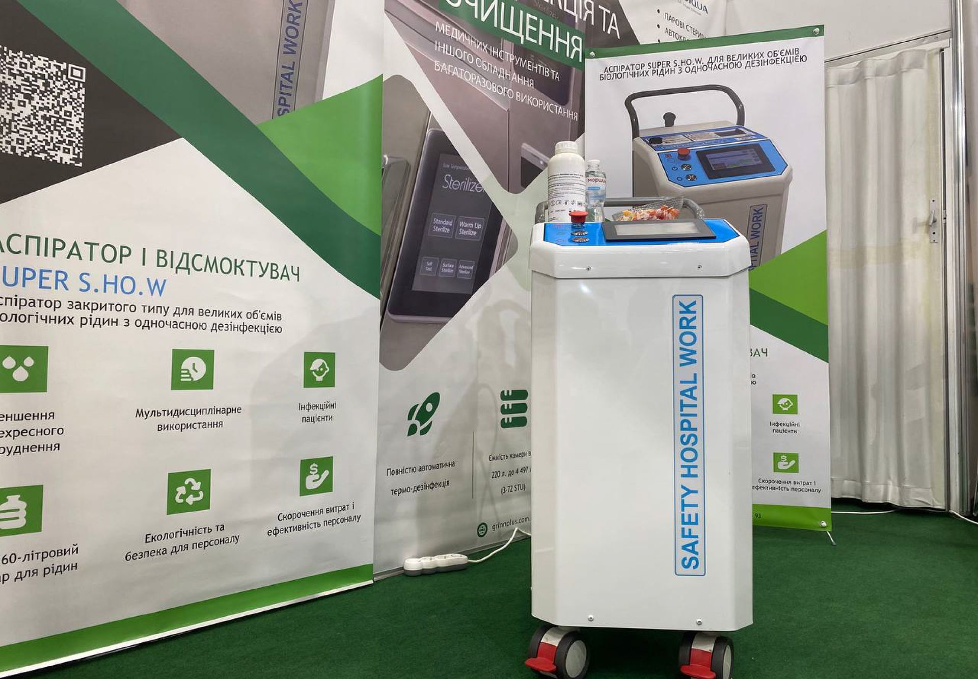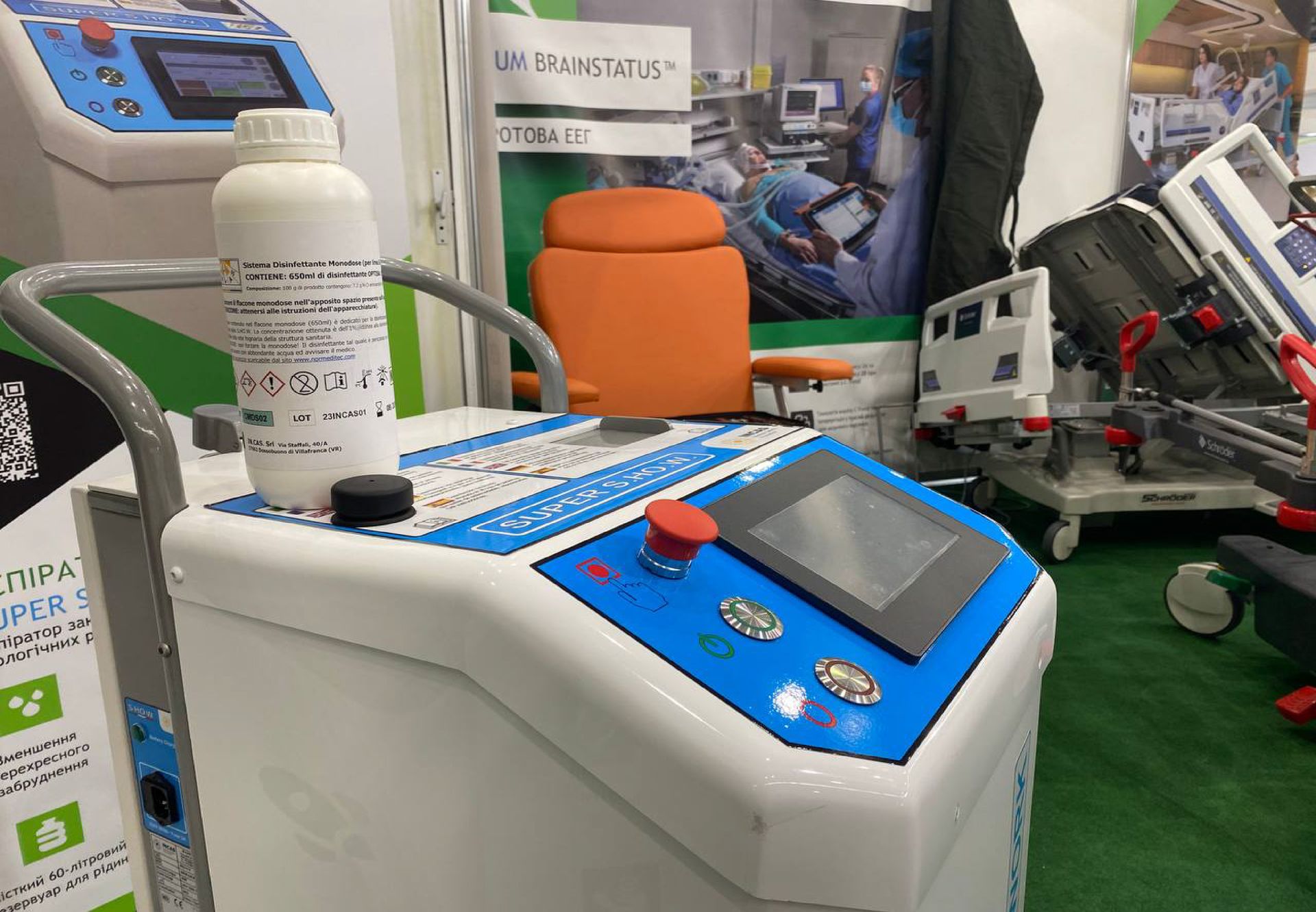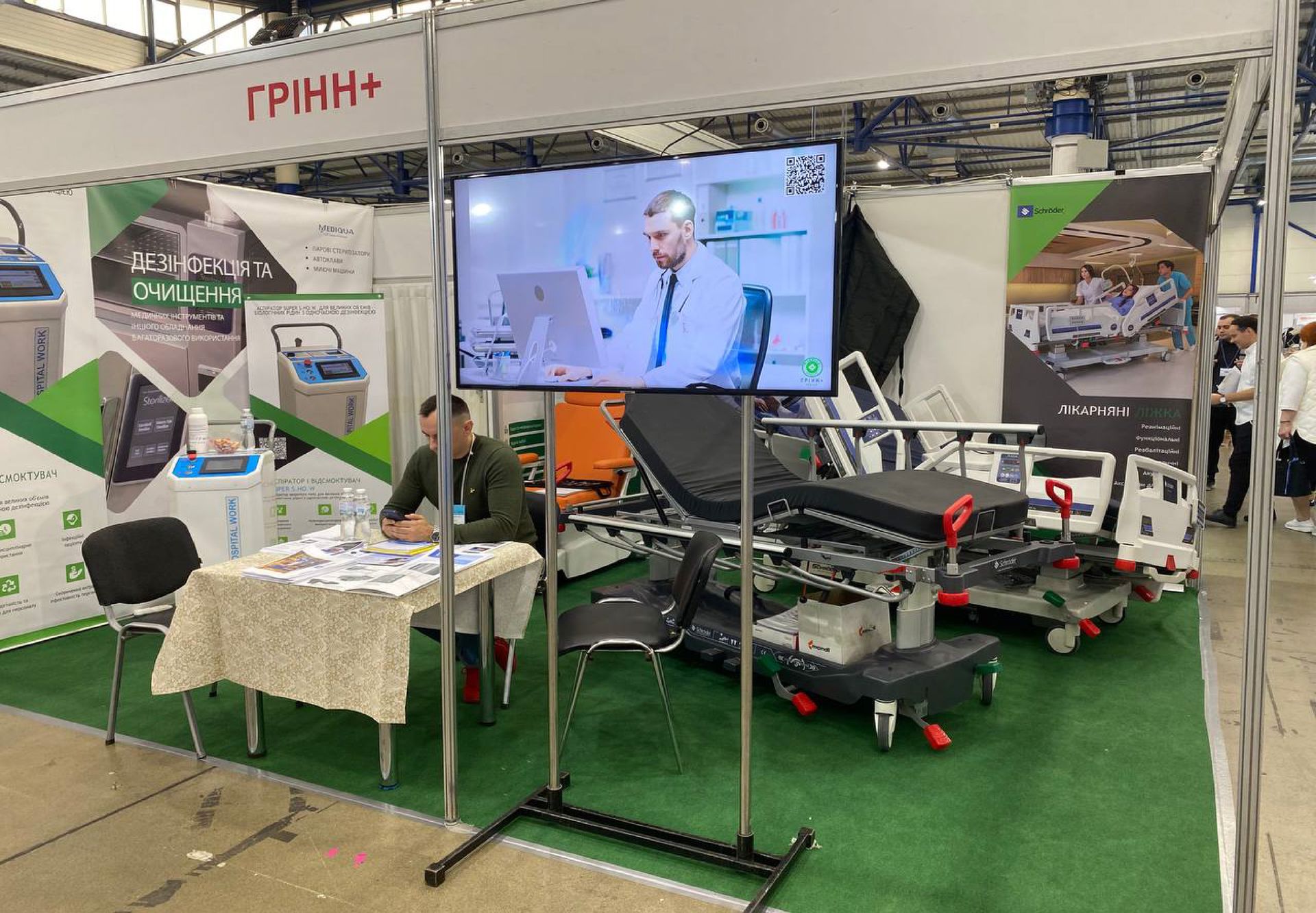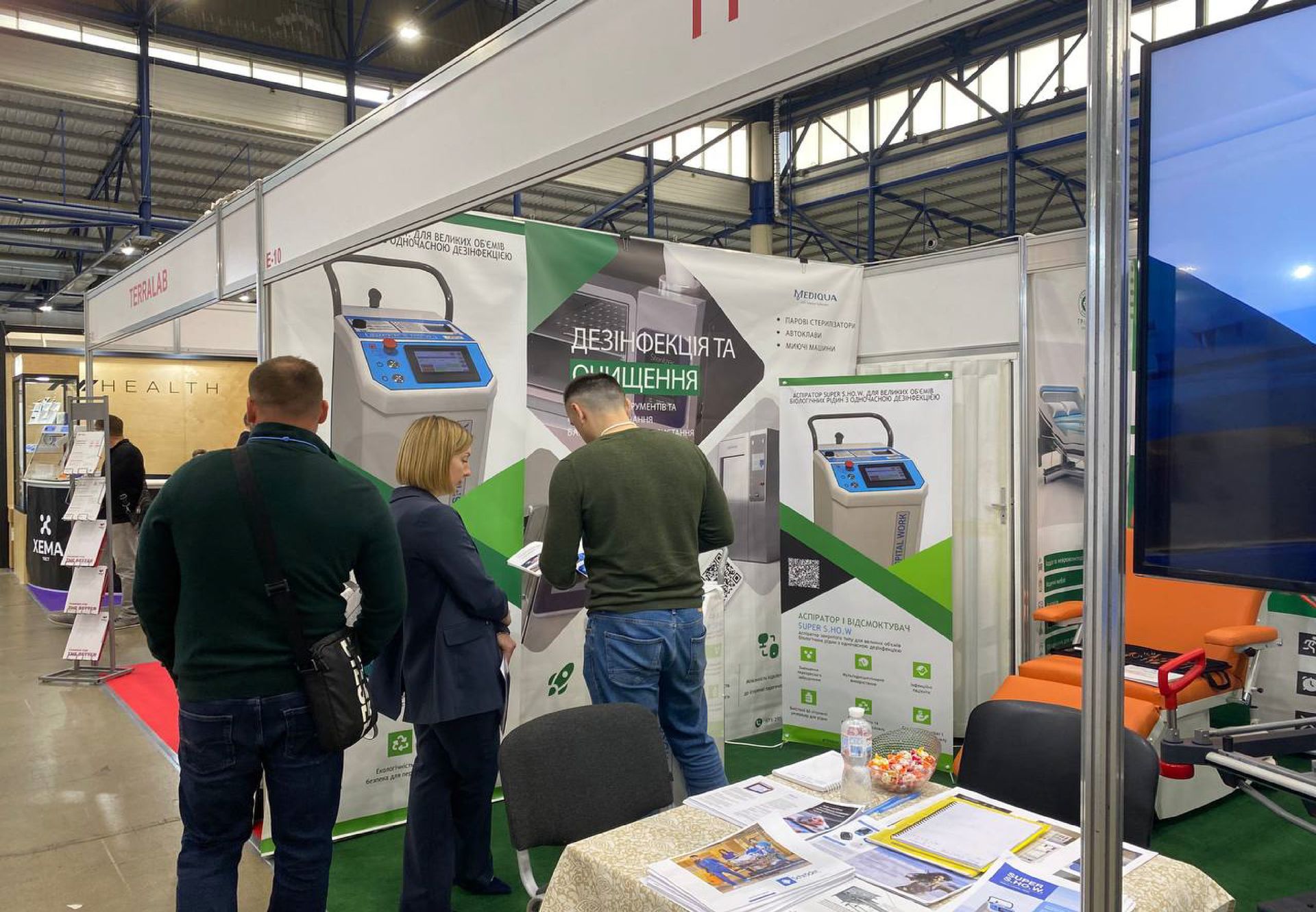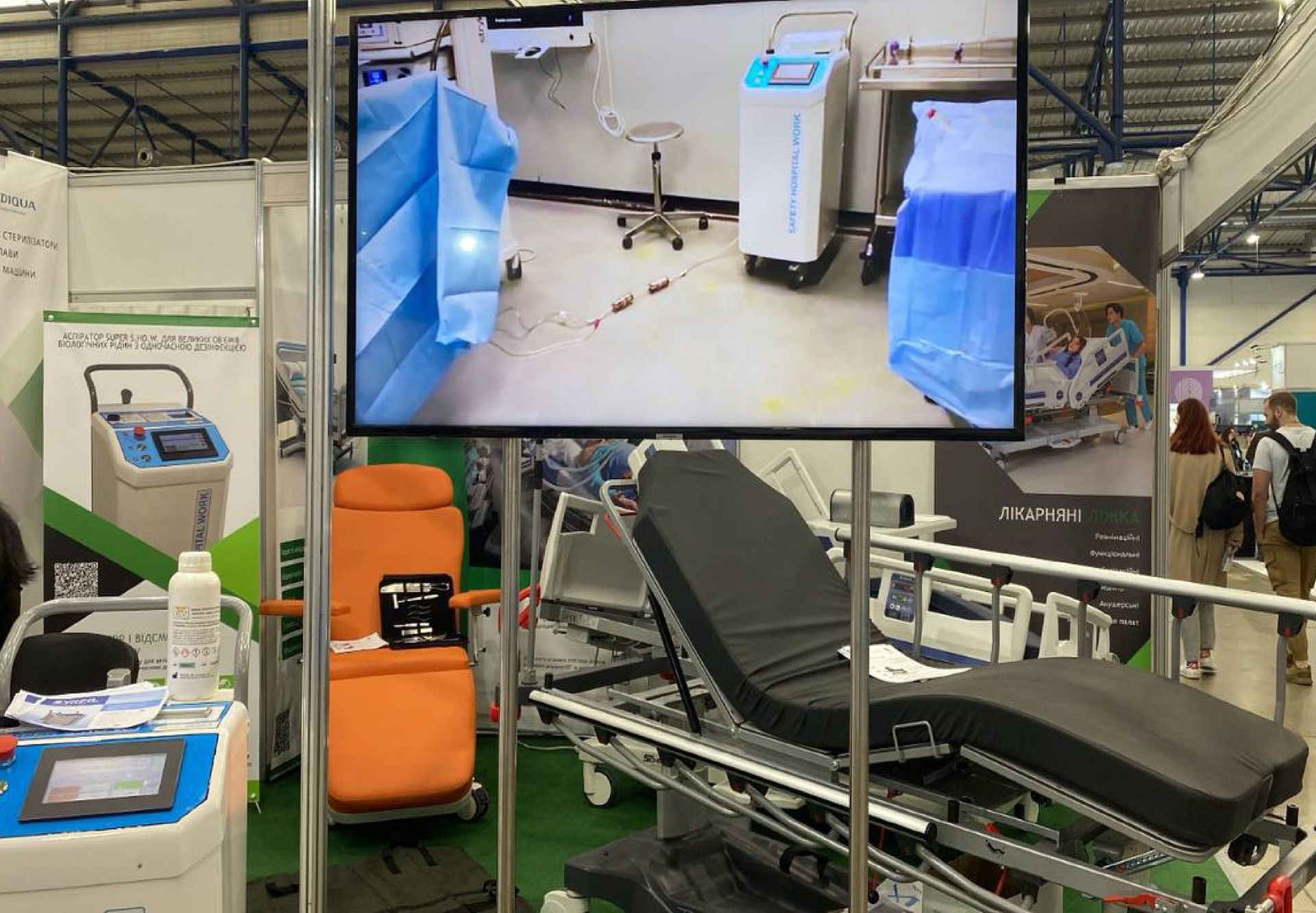 Нами було представлено на виставці широкий спектр обладнання, включаючи: хірургічну аспірацію з паралельною дезінфекцією рідини; медичні меблі (реабілітаційні функціональні ліжка, операційні крісла, транспортні каталки, меблі для палат пацієнтів та безліч інших); обладнання для моніторингу стану пацієнта (у тому числі ЕЕГ пристрої, холтери для аналізу ЕКГ та моніторингу апноє сну та інше високоякісне обладнання Bittium); миючі машини (автоклави), обладнання для моргів (меблі, операційні інструменти та витратні матеріали). Ми пишаємося можливістю сприяти розвитку медичної галузі, надаючи широкий вибір продукції, яка відповідає найвищим стандартам якості та безпеки.