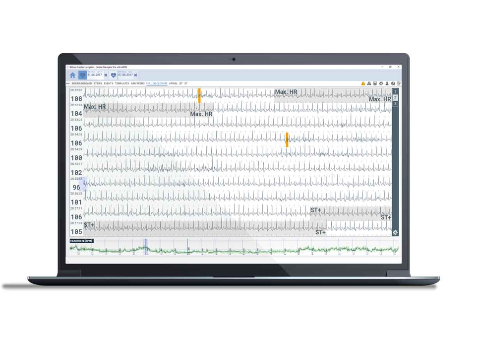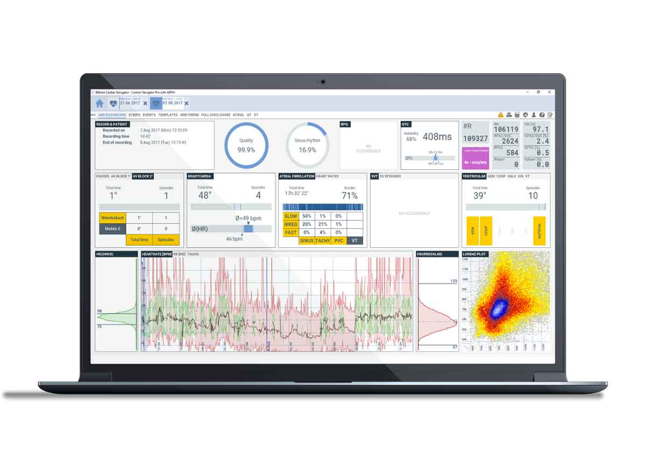 Програмне забезпечення Bittium Cardiac Navigator™ — це гнучке та універсальне рішення для проведення клінічного холтерівського аналізу та моніторингу ЕКГ. Його зручне та інформативне представлення даних і інтуїтивно зрозумілі інструменти аналізу роблять програмне забезпечення ефективним і простим у використанні під час аналізу записів ЕКГ для лікаря. І медичний персонал вивчає та розуміє роботу Електрокардіографа лише за кілька днів.