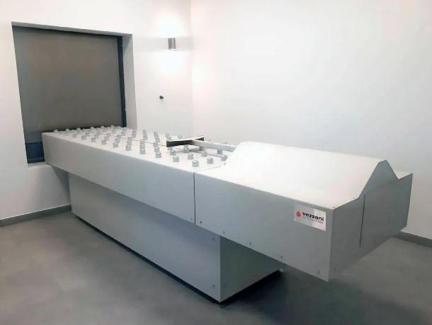 Крім того, підтримка труни і її пересування гарантується сферичними роликовими опорами, якими керує клавіатура з кнопками для кожної конкретної функції. Ця клавіатура оснащена кнопкою Аварія, перемикачем режимів роботи Аатоматичний/Ручний і кнопкою Скидання.