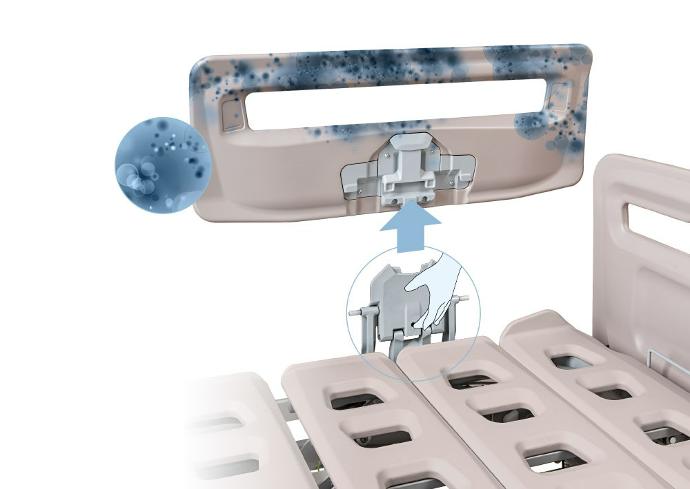 Кнопка розблокування для безпечного зняття пластикового бічного поручня. Інтуїтивно зрозумілий і простий у виконанні. Повернувшись до ліжка, він легко та безпечно закріплюється назад у гніздо без жодного ризику помилки, забезпечуючи безпеку ваших пацієнтів у будь-який час.