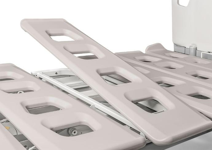 Платформа складається з 4 секцій із 3 з’єднаннями. Оснащена формованими планками з пластику, надзвичайно міцні, без гострих країв. Штанги мають внутрішній вакуум, що гарантує комфорт пацієнта. Бічні елементи обмежувача матраца вбудовані: ця система підвищує безпеку, запобігаючи ковзанню матраца під час транспортування пацієнта. Ламелі оснащені великими вентиляційними отворами для вентиляції матрацу та запобігання утворенню конденсату.
