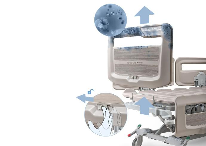 Узголів'я та підніжжя знімні як з боку голови, так і з боку ніг. Система з інтуїтивно зрозумілим одним важелем дозволяє блокувати та розблоковувати його витяг для будь-яких екстрених втручань або для звичайних операцій дезінфекції. Можливість індивідуального налаштування кольору вставок. По кутах оригінальні інтегровані бампери з м'якого пластику, які гарантують безпеку при випадкових зіткненнях.